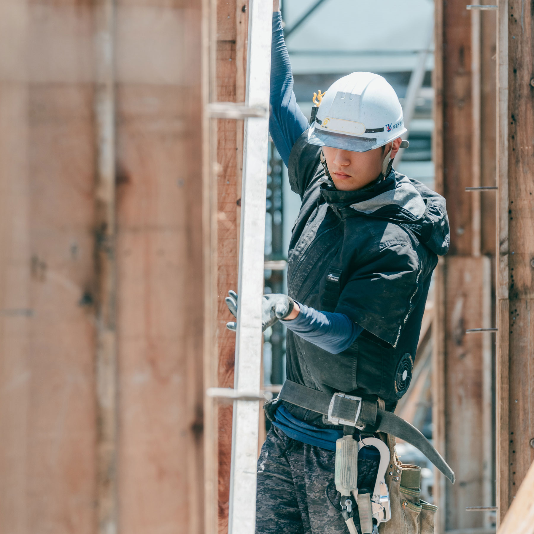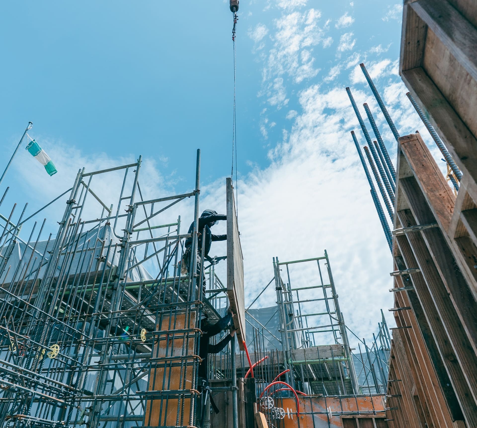 建物の躯体を形づくるコンクリートを流し込むための型枠を作成します。 通常は前工程の鉄筋工事の後に、コンパネや支保材を組み立て、そこへコンクリートを打設します。 コンクリートが十分に硬化した後、型枠を取り外し、次の工程へと引き継ぎます。