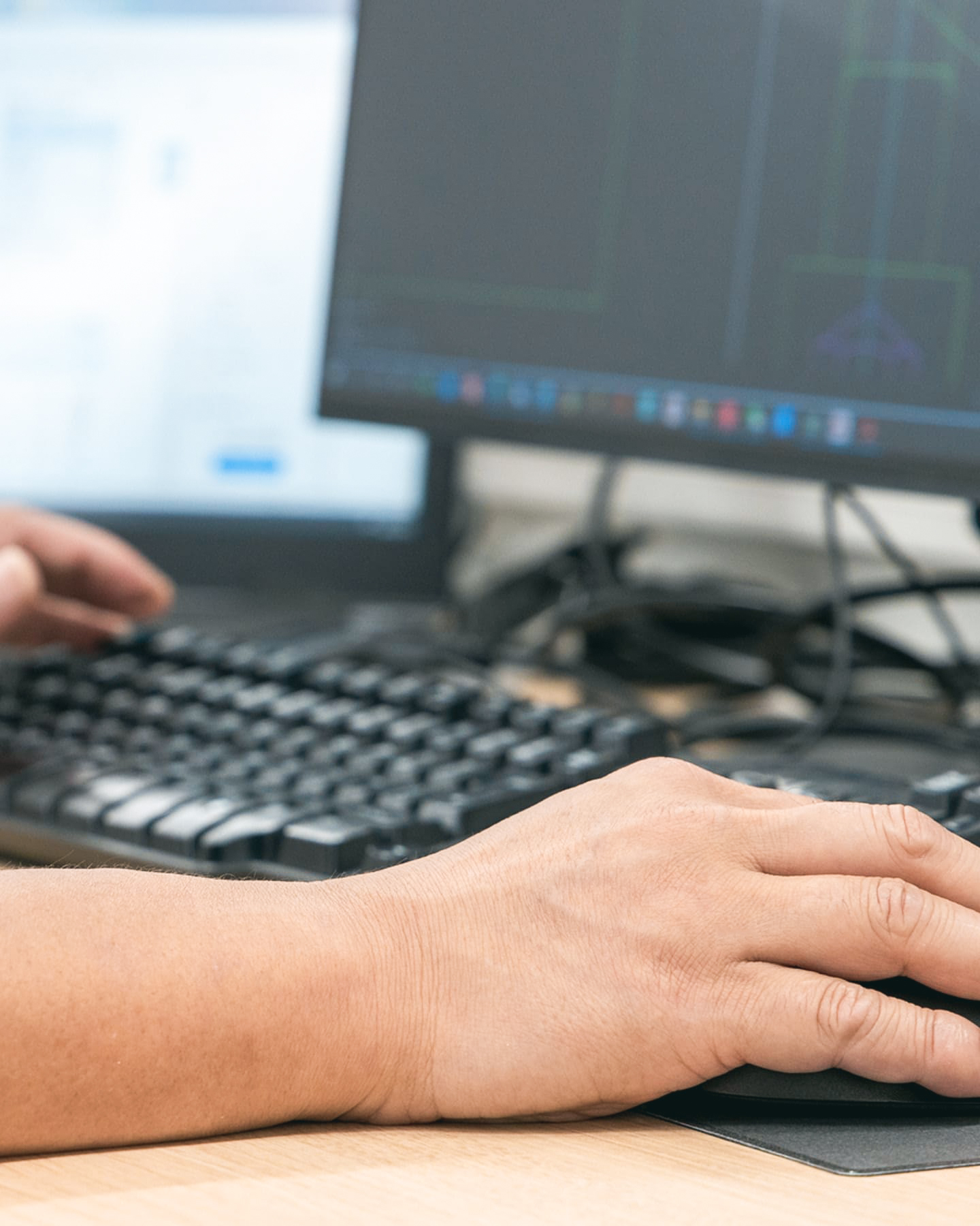 - 発注者様(元請企業様)から全体の建築図面をいただき、それを基に、新たに型枠用の図面を作成します。図面作成にはCADを使用します。同時に、施工現場に出向いて現場検証を行います。質の高い施工を安全で迅速に行うために、どのように作業を進めるか、そういったことも検討を行い、社内で共有します。